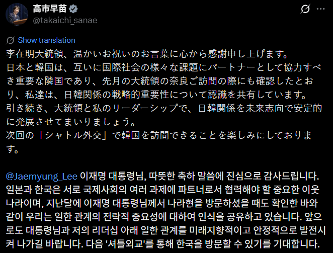다카이치 총리는 9일 자신의 엑스에 일본어와 한국어로 올린 글에서 “이재명 대통령님, 따뜻한 축하 말씀에 진심으로 감사드린다”고 밝혔다.