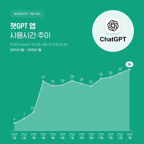 10일 실시간 앱·결제 데이터 분석 기업 와이즈앱·리테일이 한국인 스마트폰 사용자 대상으로 표본 조사한 결과 지난 1월 챗GPT 앱 사용 시간은 총 34억분으로 집계됐다.