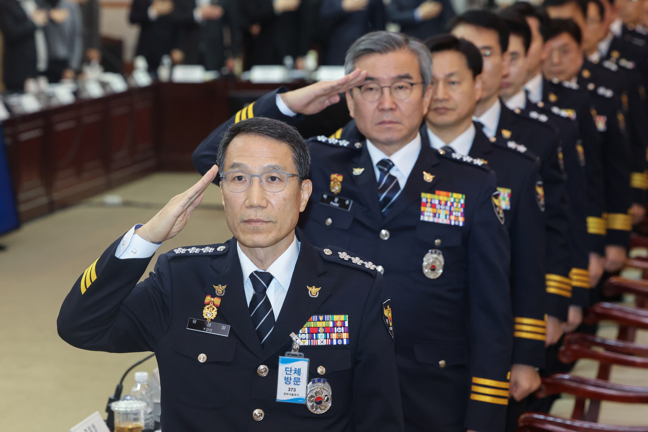 유재성 경찰청장 직무대행(사진 왼쪽)과 박성주 국가수사본부장이 지난달 12일 서울 종로구 정부서울청사에서 열린 행정안전부 주관 경찰청 및 산하기관 업무보고에 참석해 국민의례를 하고 있다. [연합] |
