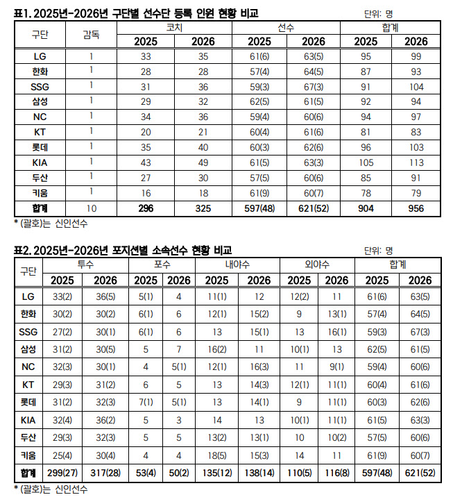 KBO는 10일 2026년 KBO 리그 소속 선수 명단을 공시했다. 10개 구단은 총 621명의 선수를 등록했다. 597명이 등록했던 2025년보다 24명이 늘어났다.