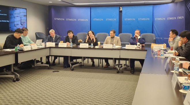 미국 싱크탱크 스팀슨센터 전문가들이 9일(현지시간) 워싱턴DC 사옥에서 한국 특파원들과 간담회를 하고 있다. 연합뉴스 |