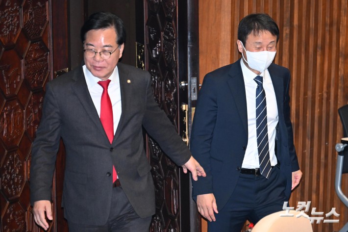 10일 서울 여의도 국회에서 열린 제432회국회(임시회) 제5차 본회의에서 더불어민주당 한병도 원내대표와 국민의힘 송언석 원내대표가 대화를 나누고 자리로 돌아가고 있다.