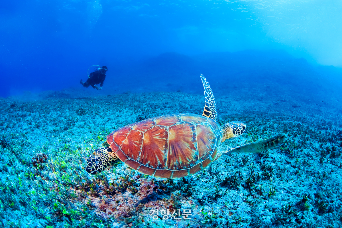 한국 연안을 비롯한 전 세계 바다에서 서식하는 푸른바다거북. 경향신문 자료사진·수중사진가 박수현씨 제공 |