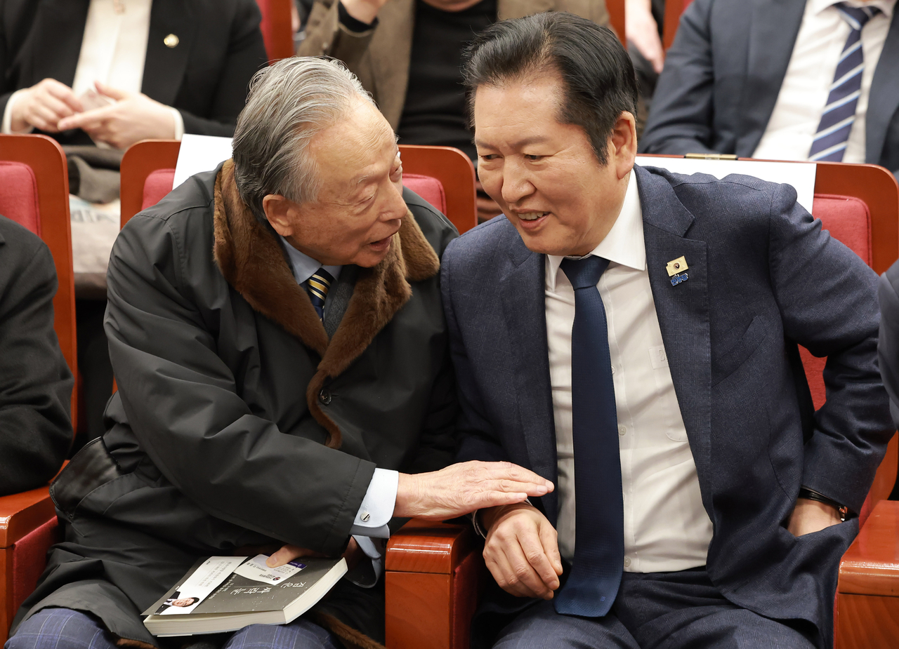 정청래 더불어민주당 대표가 10일 국회도서관에서 열린 같은 당 박찬대 의원 출판기념회에 참석해 민주당 권노갑 상임고문과 대화하고 있다. [연합] |