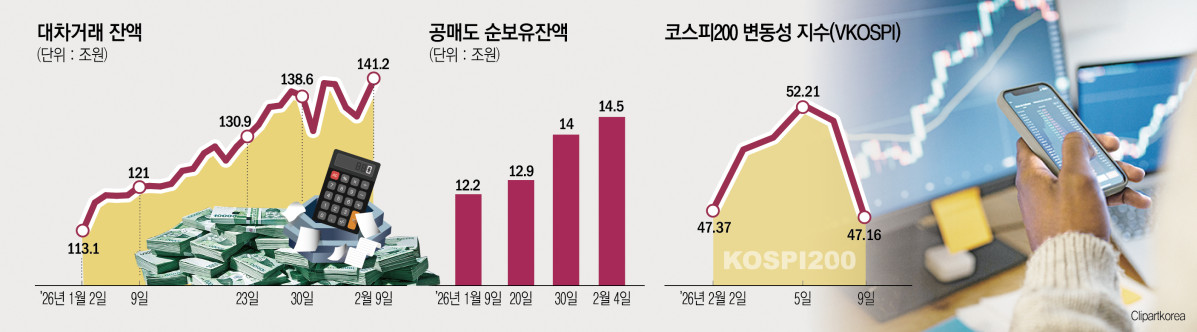 11일 한국거래소에 따르면 대차거래 잔액은 2월 9일 기준 141조2389억원으로 집계돼 사상 최대치를 기록했다. 지난해 말 110조원대에서 한 달여 만에 30조원 이상 늘었다. 대차잔액은 공매도 거래를 위해 빌려간 주식이 아직 상환되지 않은 물량으로, 필요할 때 매도로 연결될 수 있는 ‘대기 공급’ 성격을 갖는다. 통상 잔액의 상당 부분이 실제 공매도로 이어지는 만큼 잔액 급증은 시장의 경계 심리가 강화됐다는 신호로 해석된다.