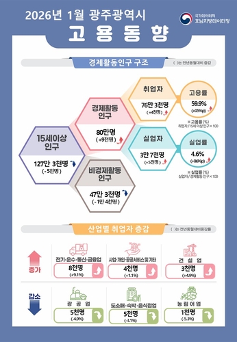 11일 호남지방데이터청이 발표한 1월 광주·전남 고용동향에 따르면 광주의 15세 이상 취업자 수는 76만3천명으로 지난해 같은 달보다 4천명(0.5%) 증가했다.