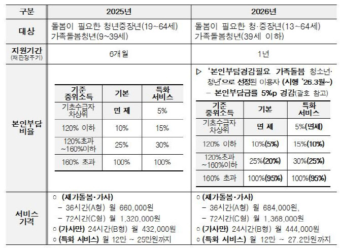 시는 올해부터 지원 대상과 서비스 내용을 확대한다. 지원 연령은 기존 만 19~64세에서 만 13~64세로 넓힌다. 다음 달부터 본인 부담 경감이 필요한 가족돌봄 청소년·청년으로 선정된 이용자는 기존 본인부담금률에서 5%포인트가 줄어 경제적 부담이 완화될 전망이다.