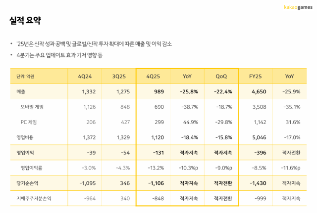 2025년 4분기 매출은 989억원으로 전년 동기 대비 약 26% 감소했다. 같은 기간 영업손실과 순손실은 각각 131억원과 1106억원을 기록하며 적자를 지속했다.