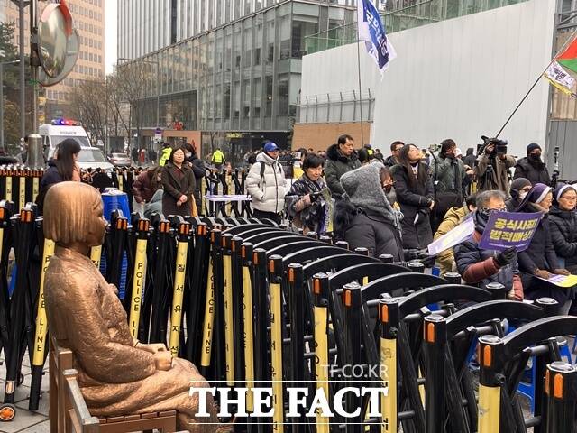 하지만 이들 단체는 최근 위안부 피해자들을 모욕한 혐의로 경찰 수사를 받게 됐고 반대 집회를 중단하면서 이날 수요시위는 소녀상 옆자리로 돌아왔다. 정의연 활동가들을 비롯해 대학생, 수녀, 외국인 등 시민 90여명은 경찰 바리케이드가 설치된 소녀상 앞으로 모였다.
