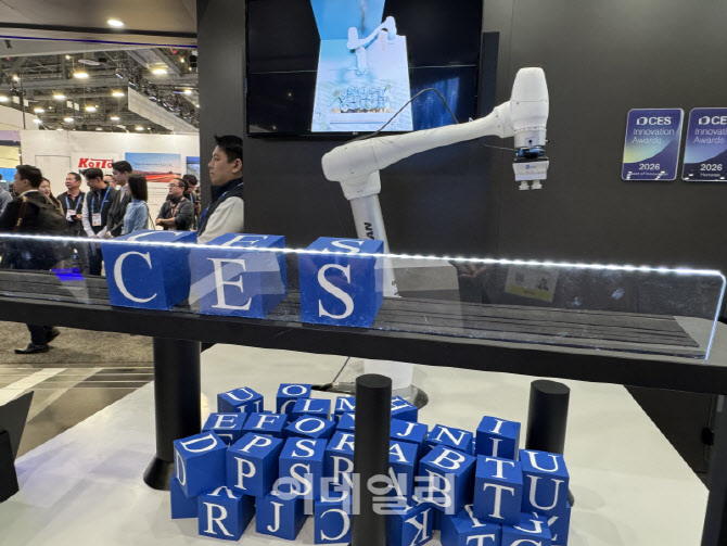 지난달 7일(현지시간) 미국 라스베이거스 컨벤션 센터(LVCC)의 두산그룹 'CES 2026' 부스에서 두산로보틱스의 인공지능(AI) 디팔레타이저가 사용자가 입력한 단어에 맞는 알파벳 블록을 찾아 배치하고 있다.(사진=공지유 기자) |