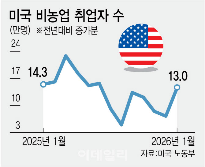 미 노동부에 따르면 1월 비농업 부문 일자리는 전월 대비 13만개 증가했다. 시장 예상치(약 5만~6만개)를 두 배 이상 웃도는 수치다. 실업률은 4.3%로 전월(4.4%)보다 0.1%포인트 하락했고, 평균 시간당 임금은 전월 대비 0.4% 올라 예상치(0.3%)를 상회했다. 물가 압력을 다시 자극할 가능성을 준 신호다. 지난해 말 세 차례 연속 금리를 인하한 뒤 1월 회의에서 동결로 전환한 연준으로선 당분간 ‘관망 모드’를 유지할 명분을 얻은 셈이다.