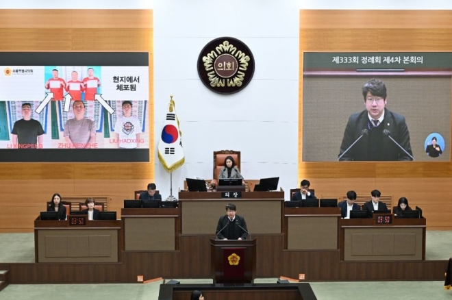 지난 제333회 서울특별시의회 제4회 본회의 중 캄보디아 내 국제범죄조직에 대한 대응으로 국내 유인 및 모집책 근절안 제안 당시 모습. 내용과는 무관 |