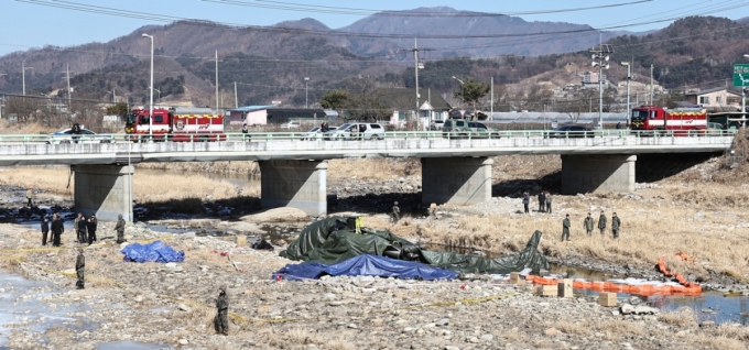 (가평=뉴스1) 김도우 기자 = 9일 경기 가평군 조정면 현리 군 헬기(코브라 AH-1S)가 추락해 현장에서 관계자들이 사고를 수습하고 있다. 2026.2.9/뉴스1 Copyright (C) 뉴스1. All rights reserved. 무단 전재 및 재배포, AI학습 이용 금지. /사진=(가평=뉴스1) 김도우 기자 |