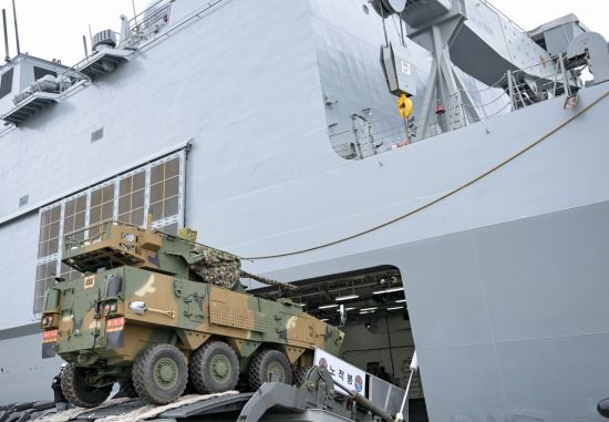 해군ㆍ해병대 코브라골드 훈련전대가 12일 출항에 앞서 지난 10일 해군 부산작전기지에서 해군 상륙함 노적봉함(LST-Ⅱ, 4900t급)에 해병대 차륜형대공포 '천호'(K-30W)를 탑재하고 있다. 사진제공=해군 |