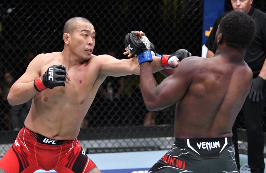 UFC 9승을 기록중인 박준용(왼쪽)이 10승 고지에 재도전한다. 사진은 지난 2021년 타폰 은추키에게 원투를 날리는 박준용의 모습. [UFC 제공] |