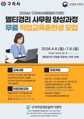 구리시(시장 백경현)는 구리여성새로일하기센터(성평등가족부·고용노동부 지정, 이하 구리새일센터)에서 취업을 희망하는 여성을 대상으로 운영하는 '멀티경리 사무원 양성과정' 교육생을 오는 2월 19일부터 모집한다고 밝혔다.
