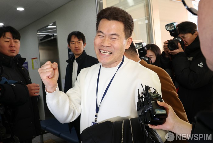 [서울=뉴스핌] 정일구 기자 = 이재명 대통령에 대한 허위 사실을 유포한 혐의로 고발된 한국사 강사 출신 보수 유튜버 전한길 씨가 12일 오전 서울 동작구 동작경찰서에서 피의자 신분 소환 조사를 받기 위해 출석하고 있다. 2026.02.12 mironj19@newspim.com