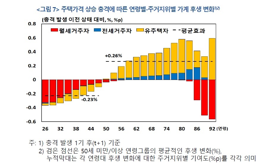특히 유주택자만을 대상으로 한 분석에서도 50세 미만의 후생은 감소하는 것으로 나타났다. 이는 자가 거주 1주택자라 하더라도 향후 주거사다리 상향이동을 위한 추가 저축과 차입 확대가 필요해 소비 여력이 줄어들기 때문으로 풀이된다. 반면 고령층과 다주택자의 경우 보유주택 가치 상승에 따른 자산효과가 우세하게 작용했다.