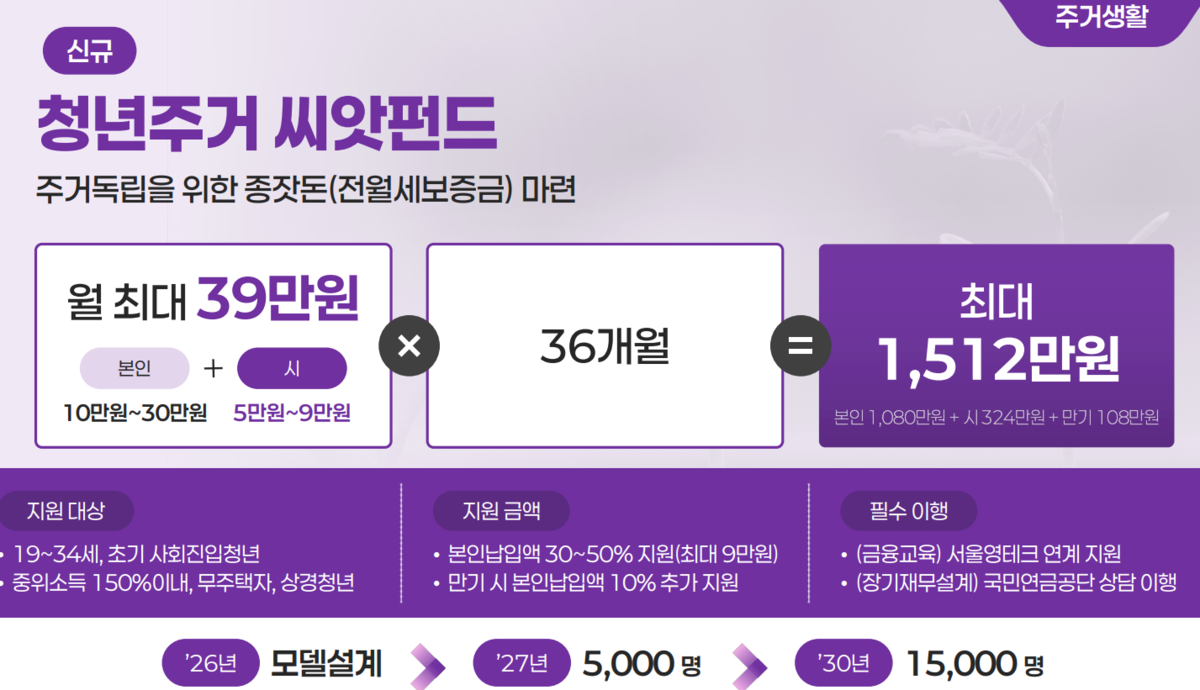 서울시가 청년의 주거 안정을 위해 본인 납입액의 최대 50%를 시가 지원하는 ‘청년주거씨앗펀드’를 내년부터 운영한다. 업무에 대한 실무 경험을 지원하는 서울영커리언스를 도입하고 비정규직 청년의 국민연금 가입액의 절반을 부담하는 ‘청년미래든든연금’도 추진한다.
