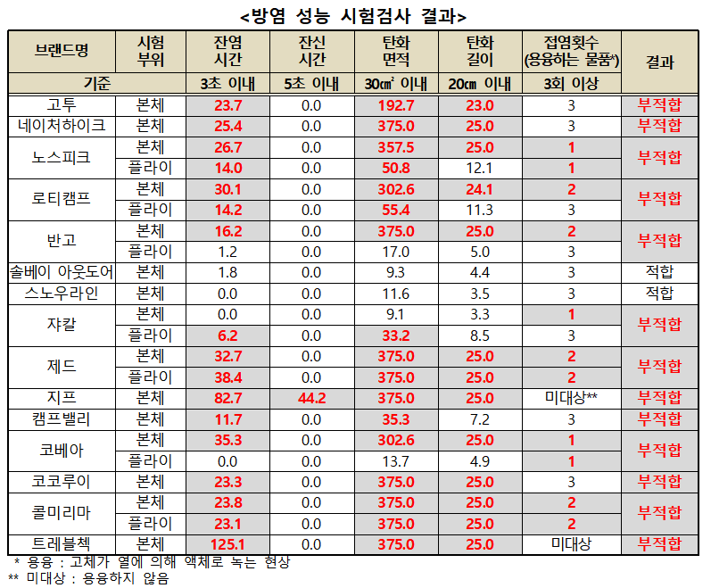 국내 안전기준에 따르면 텐트는 방염 제품으로 표시하는 경우 ‘방염성능기준’의 5가지 항목(잔염시간·잔신시간·탄화면적·탄화길이·접염횟수)에 모두 적합해야 한다.