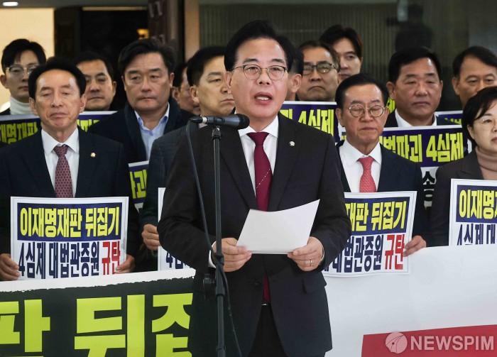 [서울=뉴스핌] 윤창빈 기자 = 송언석 국민의힘 원내대표가 12일 서울 여의도 국회 로텐더홀에서 열린 4심제 위헌악법 규탄대회에서 규탄사를 하고 있다. 2026.02.12 pangbin@newspim.com