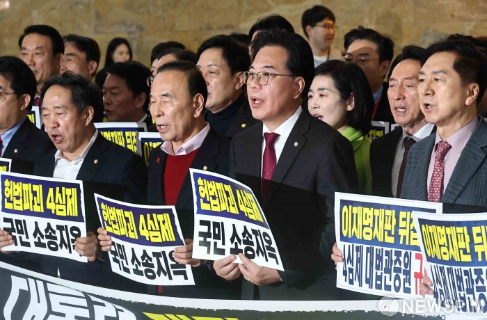 [서울=뉴스핌] 윤창빈 기자 = 송언석 국민의힘 원내대표 등 소속 의원들이 12일 서울 여의도 국회 로텐더홀에서 열린 4심제 위헌악법 규탄대회에서 구호를 외치고 있다. 2026.02.12 pangbin@newspim.com