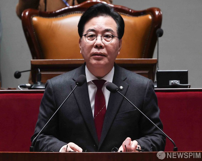[서울=뉴스핌] 윤창빈 기자 = 송언석 국민의힘 원내대표가 12일 서울 여의도 국회에서 열린 의원총회에서 모두발언을 하고 있다. 2026.02.12 pangbin@newspim.com