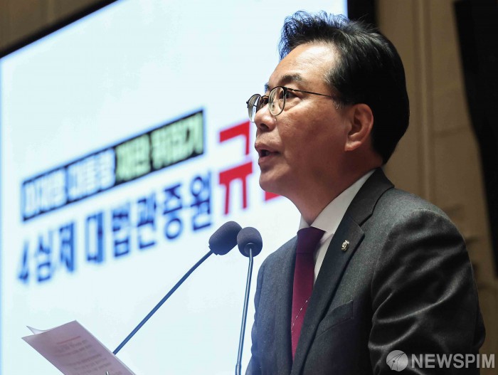 [서울=뉴스핌] 윤창빈 기자 = 송언석 국민의힘 원내대표가 12일 서울 여의도 국회에서 열린 의원총회에서 모두발언을 하고 있다. 2026.02.12 pangbin@newspim.com