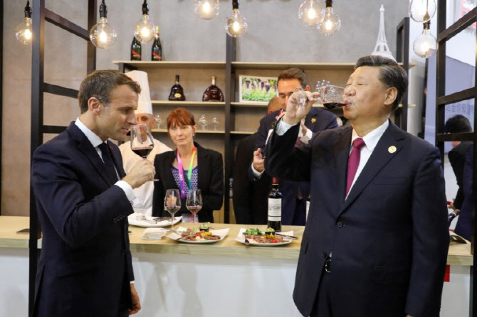 시진핑(오른쪽) 중국 국가주석과 에마뉘엘 마크롱 프랑스 대통령이 지난 2019년 11월 5일 상하이에서 열린 중국 국제 수입 박람회 프랑스관에서 와인을 마시고 있다. (사진=AFP) |