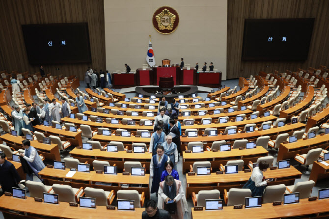 우원식 국회의장이 12일 국회에서 열린 2월 임시국회 본회의에서 산회를 선포한 뒤 한복을 입은 의원들이 본회의장을 떠나고 있다. (사진=연합뉴스) |