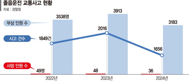 12일 파이낸셜뉴스가 경찰청에 요청해 받은 '최근 3년 졸음운전 교통사고 현황'에 따르면 지난 2022년부터 2024년까지 졸음운전 교통사고는 총 5521건 발생했다. 연도별 사고 건수는 2022년 1849건, 2023년 2016건, 2024년 1656건 등이다. 해마다 1000건 이상 졸음운전 사고가 난 셈이다.