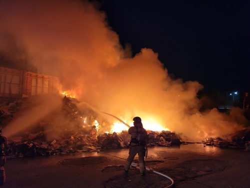(제주=연합뉴스) 전지혜 기자 = 12일 오후 7시 43분께 제주시 노형동의 한 쓰레기처리장에서 쓰레기 더미에 불이 났다는 신고가 119에 접수됐다.