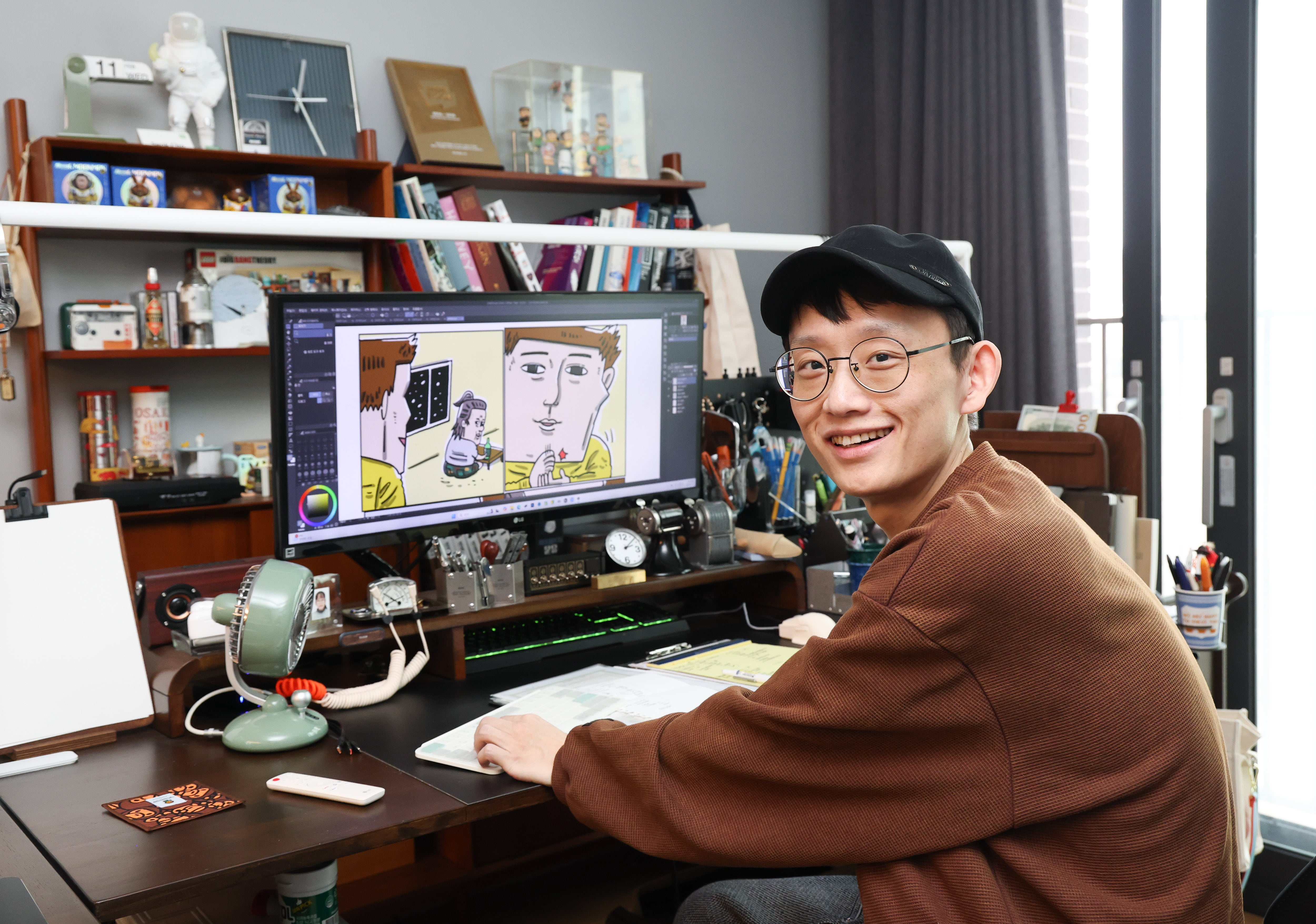 11일 서울 종로구 작업실에서 만난 웹툰 작가 조석. 20년간 웹툰을 연재하며 단 한 번도 마감에 늦은 적이 없다. 연재 일정도 빡빡해 ‘워커홀릭’이라고도 불린다. / 고운호 기자 |