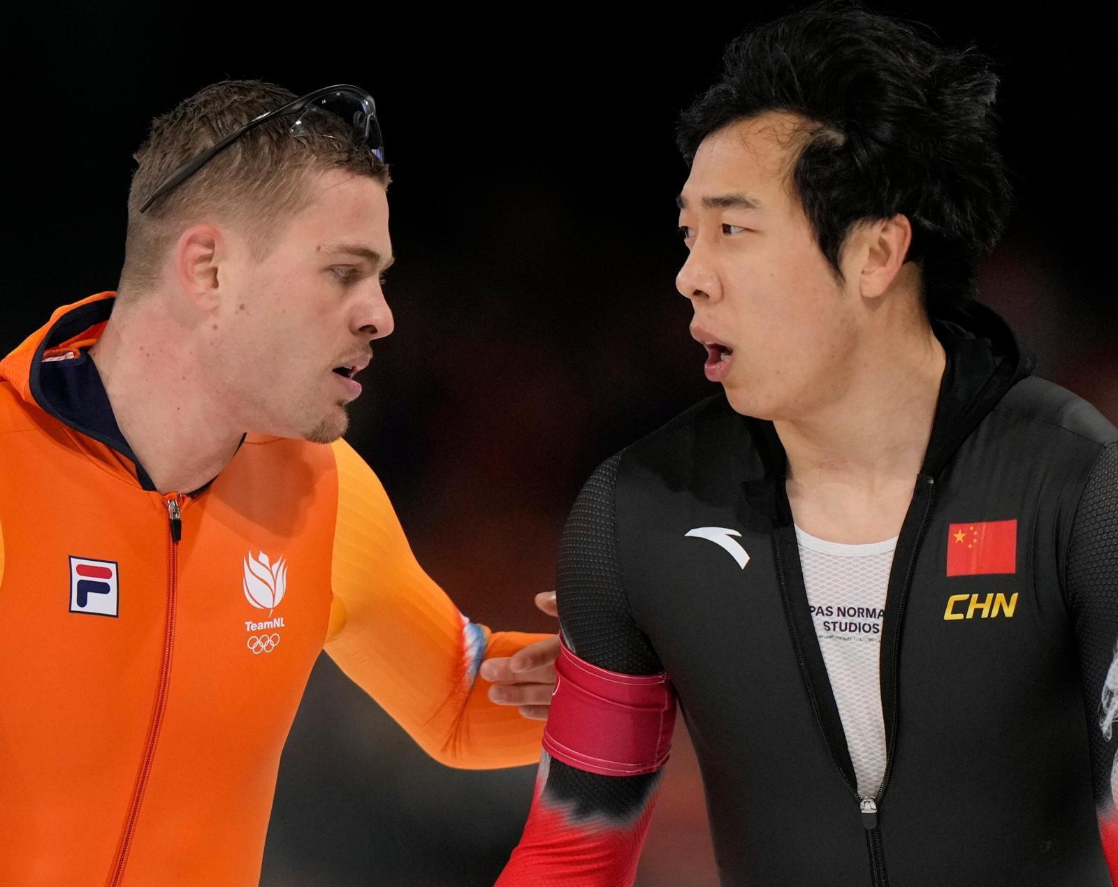 네덜란드의 유프 베네마르스(왼쪽)가 12일 열린 2026 밀라노-코르티나담페초 남자 1000m 레이스가 끝난 뒤 같은 조에서 뛴 롄쯔원(중국)에게 불만을 드러내고 있다. 이날 베네마르스는 롄쯔원의 ‘민폐 주행’ 때문에 메달을 놓쳤다. 밀라노=AP 뉴시스 |