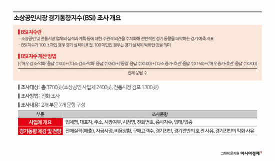 2001년 8월 처음 실시된 BSI 지수 조사는 소상공인 및 전통시장 업체의 매출과 자금 사정 등 경기동향 체감과 전망을 전화 조사해 종합적으로 분석한다. 지수가 기준치인 100 이상이면 경기 호전, 100 미만이면 경기 악화를 의미한다. 정부는 상인들이 체감하는 경기 동향 및 경영 애로 요인 파악과 대응 정책 수립을 위한 기초 자료로 BSI 지수를 활용하고 있다.