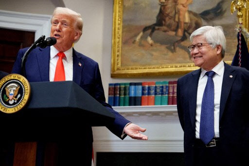 도널드 트럼프 미국 대통령(왼쪽)이 작년 3월3일(현지시간) 워싱턴DC 백악관 루스벨트룸에서 TSMC의 웨이저자 최고경영자(CEO)와 함께 발언하고 있다.(사진=AFP) |