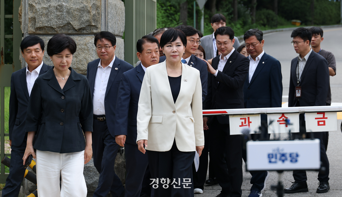 더불어민주당 3대 특검 종합대응 특별위원회 소속 의원들이 지난해 8월11일 경기 의왕 서울구치소를 방문한 뒤 취재진에게 입장을 밝히기 위해 걸어오고 있다. 이들은 윤석열 전 대통령 체포영장 집행 당시 영상 기록을 확인해야 한다고 주장했다. 권도현 기자 |
