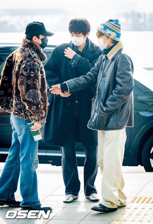 엑소 세훈과 찬열, 카이가 출국에 앞서 신호를 기다리고 있다. 2026.02.13 / soul1014@osen.co.kr