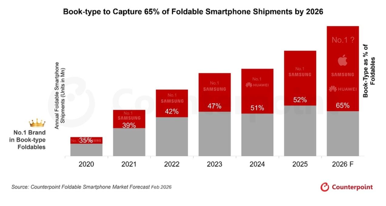13일 카운터포인트리서치에 따르면 북타입 제품 비중은 지난해 52%에서 올해 약 65%로 확대되며 전 세계 폴더블 출하량의 상당 부분을 차지할 전망이다. 반면 위아래로 접는 클램셸형은 디자인과 휴대성을 앞세운 보완적 라인업으로 역할이 재편되면서 전체 비중이 점진적으로 낮아질 것으로 관측됐다.