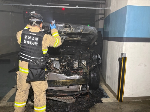 (천안=연합뉴스) 유의주 기자 = 13일 오후 1시 29분께 충남 천안시 서북구 불당동 고층 주상복합 건물 상가동 지하주차장에 있던 SUV에서 불이 났다.