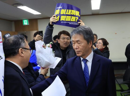 지난 5일 서울 중구 국가인권위원회에서 열린 김용원 상임위원 이임식에서 김 위원이 참석자와 인사하고 있다. 김 위원 주변에 전국공무원노동조합 인권위 지부 조합원들이 공식회의록에 기록된 김 위원의 폭언 발언을 손팻말에 적어 시위하고 있다. 연합뉴스 |