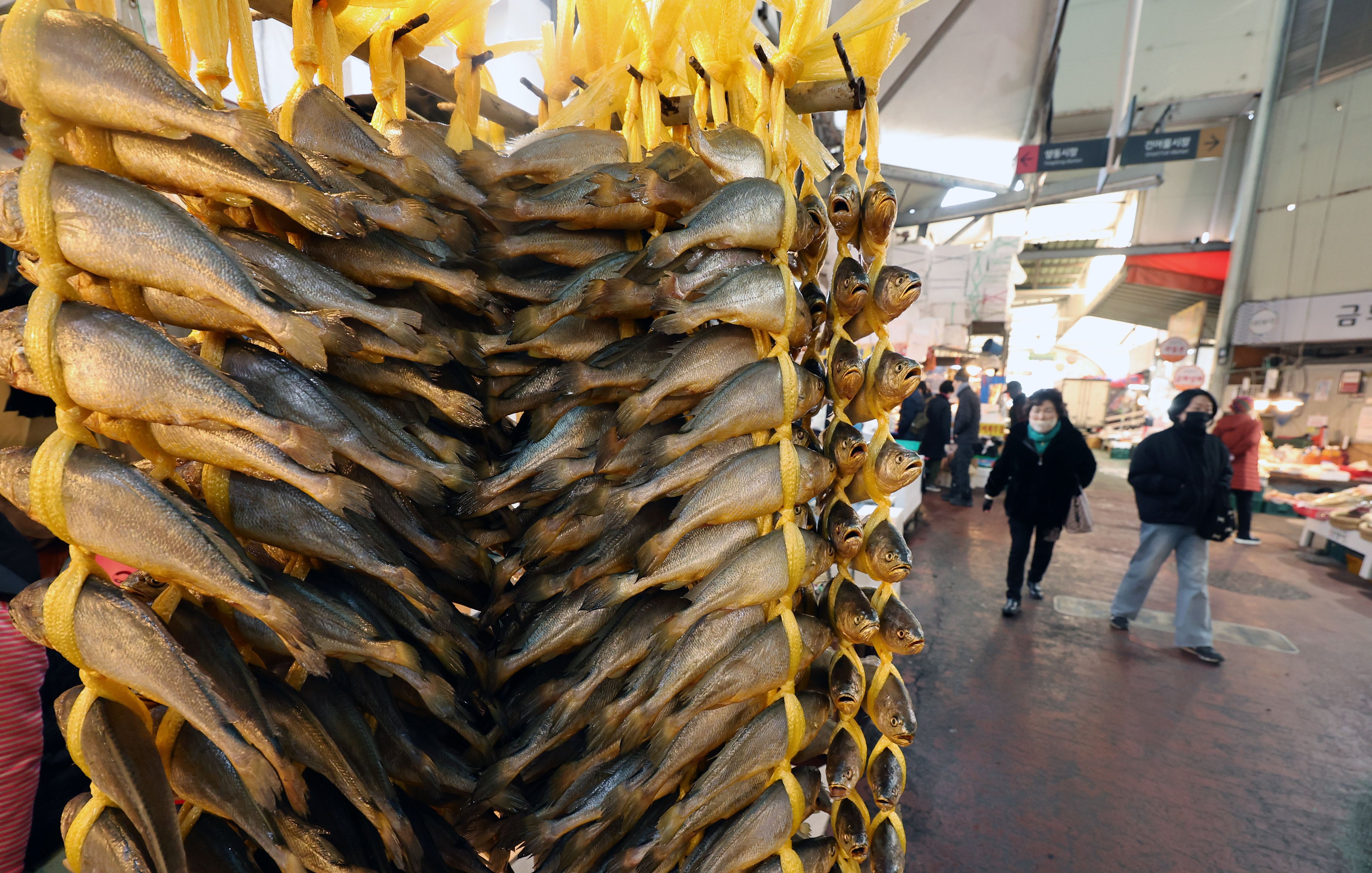 12일 광주 서구 양동시장에 굴비가 걸려있는 가운데 장을 보려는 시민들의 발걸음이 이어지고 있다. /뉴스1 |