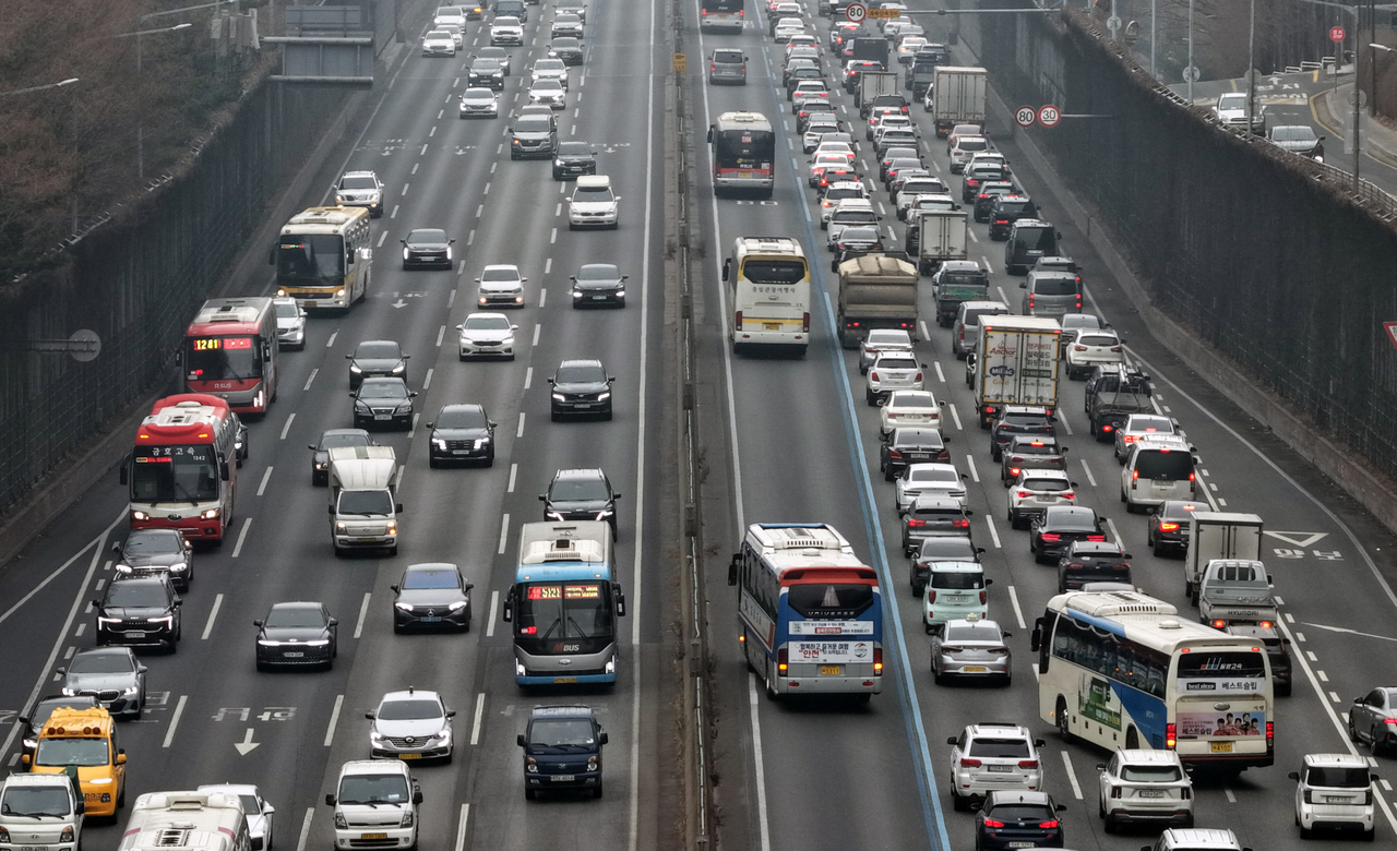 설 연휴를 앞둔 지난 13일 서울 서초구 반포IC 인근 경부고속도로 차량 통행이 정체되고 있다. [연합] |