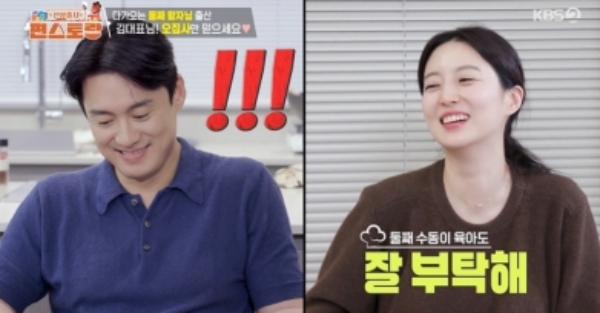 밤 10시 퇴근한 김소영은 오상진의 한상차림을 맛있게 먹었다. 김소영은 늦은 밤까지 자신을 위해, 뱃속 둘째를 위해 열심히 요리한 남편에 대한 고마움도 잊지 않았다. 잘 먹는 아내를 보며 오상진은 ‘찐 행복’ 넘치는 빙구 미소를 쏟아냈다. 김소영은 “남편과 딸 덕분에 집에만 오면 스트레스가 풀린다”라며 “(곧 태어날) 신생아를 잘 부탁할게”라고 말해 웃음을 자아냈다.