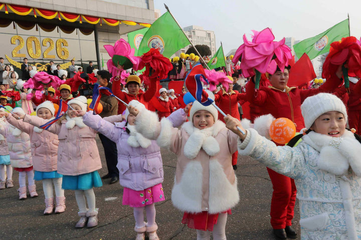 [평양=AP/뉴시스] 13일 북한 평양 동평양대극장에서 김정일 전 국방위원장의 생일(2월16일·광명성절) 84돌을 앞두고 제3차 2·16 경축 인민예술축전이 열려 어린이들이 성인들과 함께 공연을 펼치고 있다. 2026.02.14.