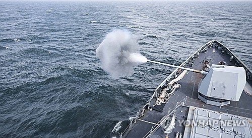 (서울=연합뉴스) 지난 25일 서해상에서 진행된 제10회 서해수호의 날 계기 전 해역 해상기동훈련에서 2함대 호위함 대전함(FFG-II, 3100톤)이 5인치 함포 사격을 하고 있다. 2025.3.26 [해군 제공. 재판매 및 DB 금지] photo@yna.co.kr |