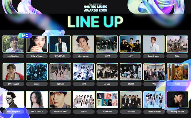 한편 'HMA 2025'는 세계 유일의 실시간 음악차트 한터차트를 운영하는 한터글로벌이 주최 주관하며 규현, 김희재, 나우즈, 루시, 박지현, 빌리, 손태진, 싸이커스, 아르테미스, 아이덴티티, 에이티즈, 에잇턴, 위아이, 윙, 이영지, 이찬원, 이창섭, 윤종신, 트리플에스, 펜타곤, 포레스텔라, 하츠투하츠, 황가람 등 23팀의 아티스트가 출연한다.