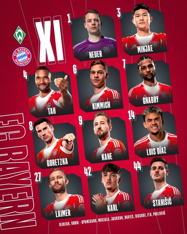 경기를 앞두고 바이에른 뮌헨이 선발 명단을 공개했다. 마누엘 노이어, 김민재, 조나단 타, 조슈아 키미히, 세르쥬 나브리, 레온 고레츠카, 해리 케인, 루이스 디아즈, 콘라트 라이머, 레나르트 칼, 요시프 스타니시치가 출격한다.