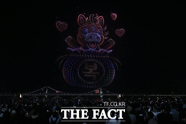 이날 공연은 '복이 깃드는 설날'을 주제로 2,500여 대의 드론이 동원됐다. 설날을 대표하는 복주머니와 붉은 말의 형상이 나오자 관람객들은 탄성을 내뱉었다.