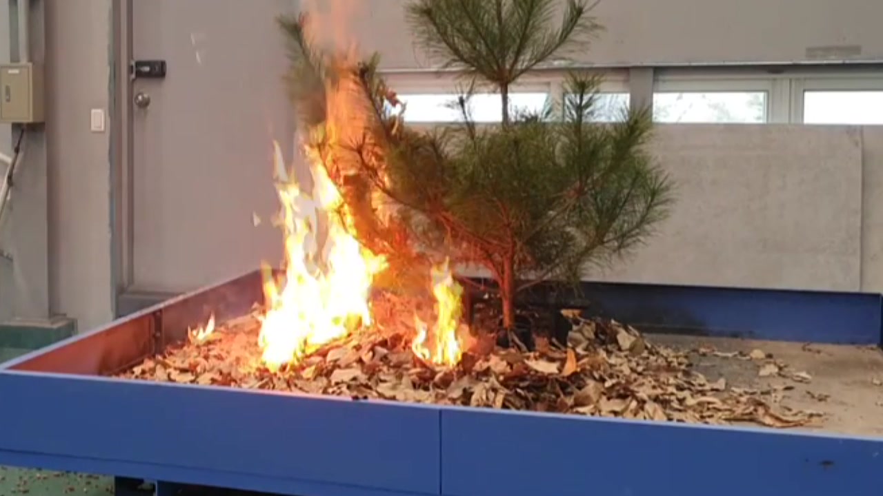 산림과 가까운 건물에서 발생한 작은 불티가 얼마나 쉽게 산불을 일으키는지 보여주는 실험입니다.